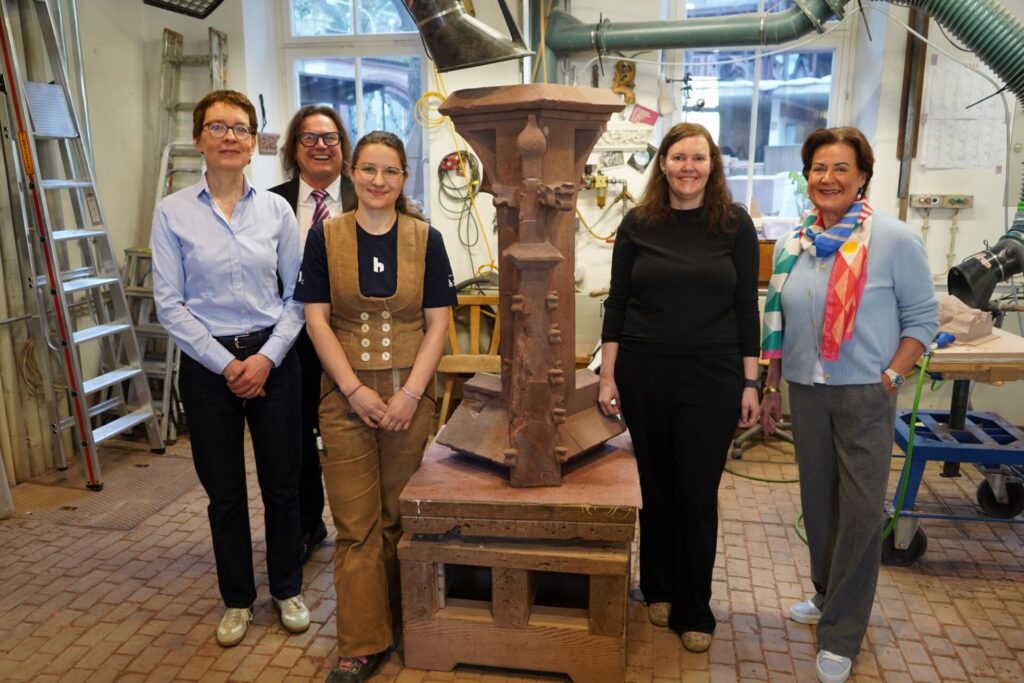 Von links: Haufe Group-CEO Birte Hackenjos, Münsterbauverein-Aufsichtsratsvorsitzender Ernst Ulrich Dobler, Steinmetz-Gesellin Maya Thyssen, Münsterbaumeisterin Anne-Christine Brehm und Münsterbauvereins-Vorsitzende Martina Feierling-Rombach. Foto: Joers